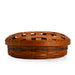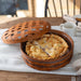 This round handcrafted basket features a sturdy wood bottom and a removable lid with an open weave design that resembles a traditional lattice crust. Perfectly sized at 13.75"D x 5"H, it easily accommodates most pie plates—so you can serve or travel with ease. The scalloped veneer trim along the tack strip adds an elegant finishing touch.